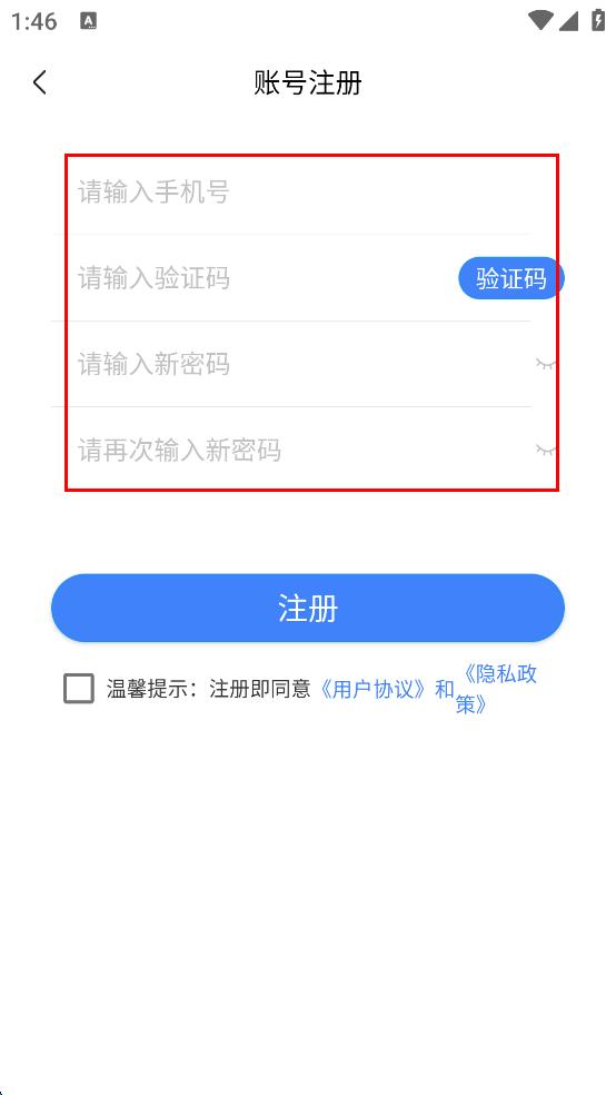 3、在账号注册页面,输入手机号,点击获取验证码,输入验证码,再设置并确认新密码。