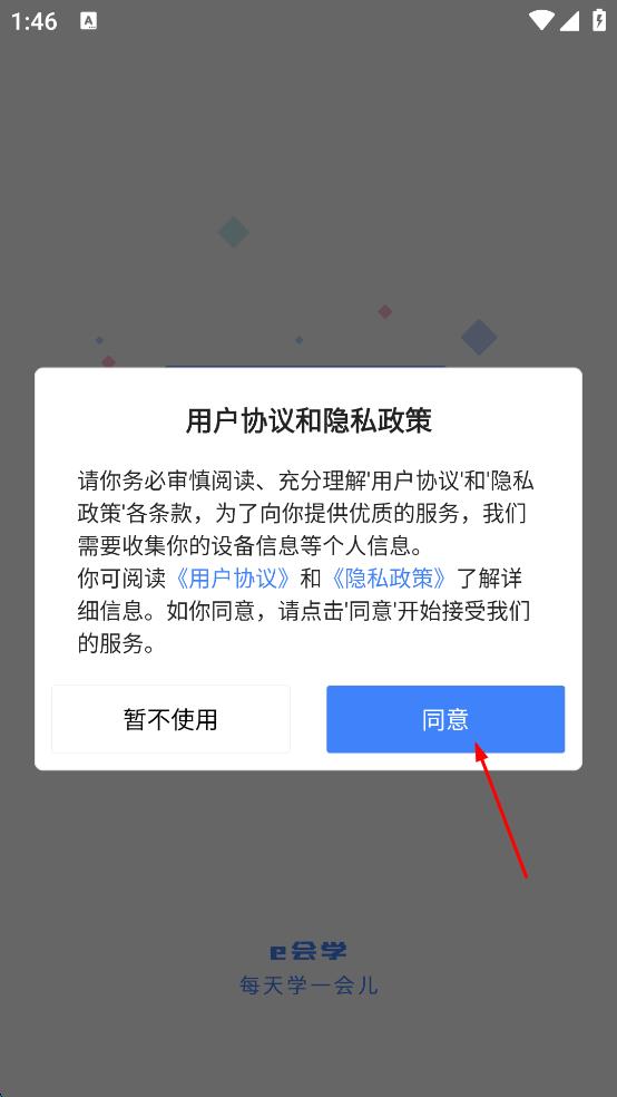 1、打开e会学,在弹出的用户协议和隐私政策页面,点击同意,进入账号登录页面。