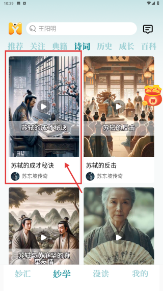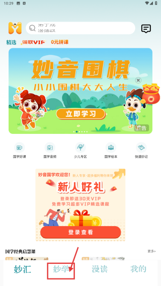 1、打开国学学习类APP,点击底部妙学选项,进入妙学页面。