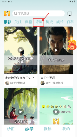 2、在妙学页面,点击诗词选项,进入诗词分类内容列表。