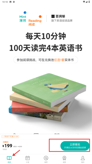 3、阅读完成后,若想参与阅读挑战,可返回首页点击立即报名按钮,参与每天10分钟,100天读完4本英语书的阅读挑战活动。