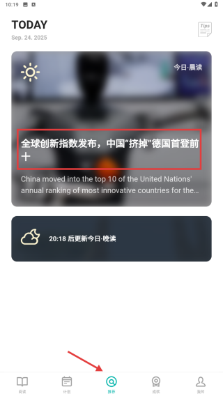 2、在阅读页面,点击今日晨读的文章条目如全球创新指数发布,中国‘挤掉德国首登前+,进入文章详情页进行阅读。