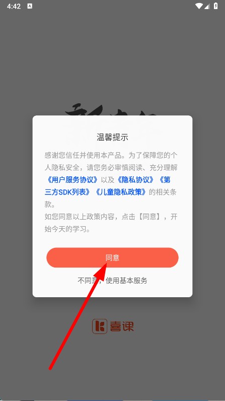 1、打开喜课新概念英语,在温馨提示弹窗中点击同意。