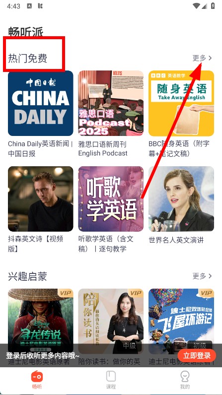 2、进入APP后,找到畅听派板块下的热门免费,点击其右侧的更多。