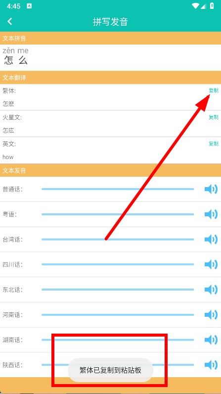 4、若需要复制某类翻译,点击对应翻译右侧的复制按钮,即可将内容复制到剪贴板。