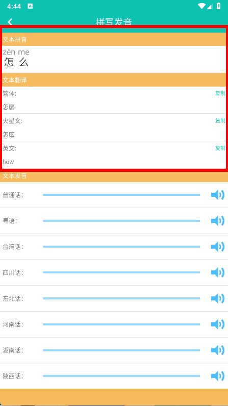 3、在拼写发音页面,查看文本拼音、文本翻译等内容。