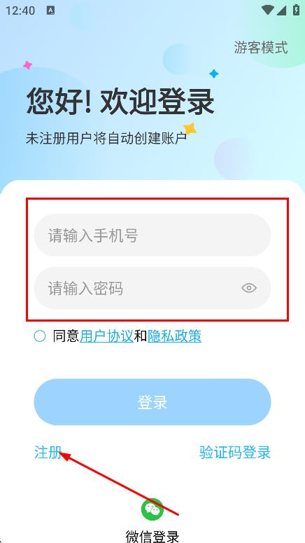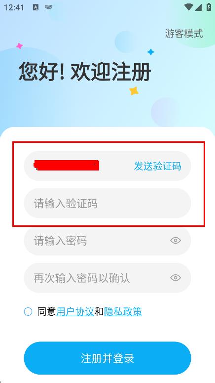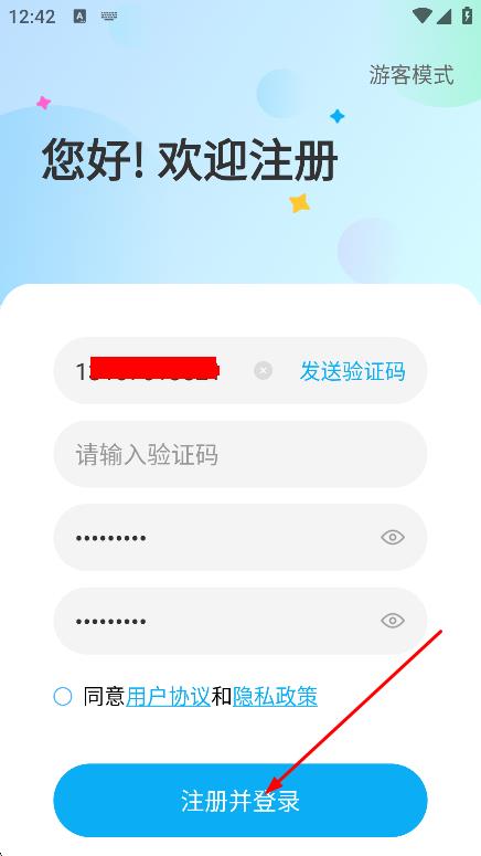 4、勾选同意用户协议和隐私政策后,点击注册并登录,完成注册登录。