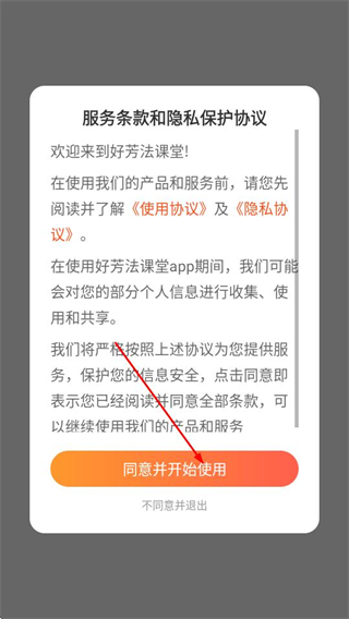 1、打开好芳法课堂APP,在弹出的服务条款和隐私保护协议界面,点击同意并开始使用。