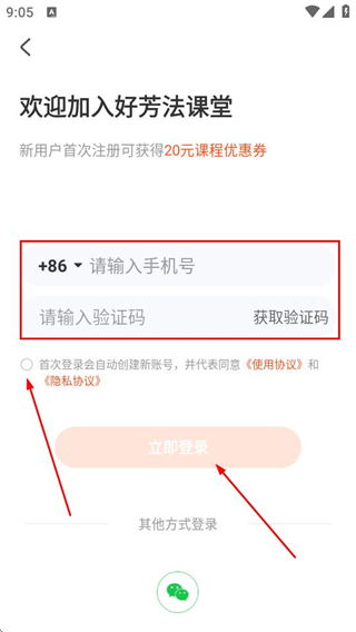 4、输入手机号码,填入验证码填,勾选同意相关协议后,点击立即登录即可。