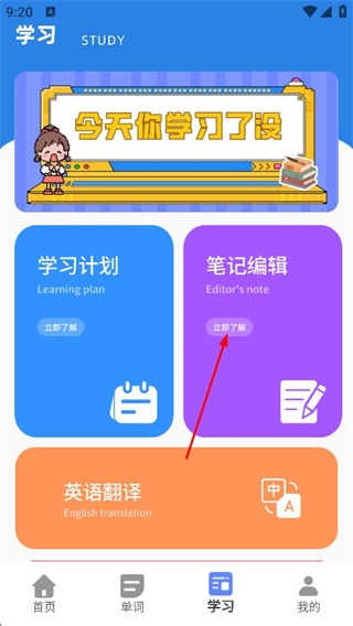 2、在学习页面,点击笔记编辑旁的立即了解,进入我的笔记页面。
