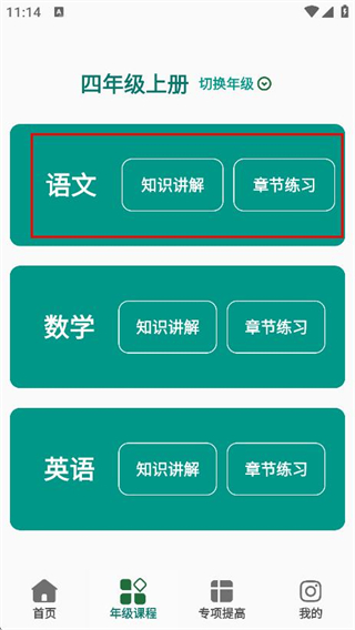 2、在年级课程页面,点击学科知识讲解,进入语文知识讲解单元列表页面。