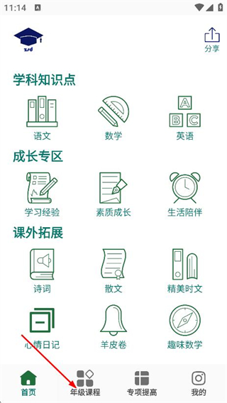 1、在小学乐学助手的首页,点击底部的年级课程,进入年级课程页面。