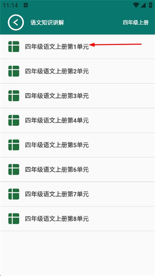 3、在语文知识讲解单元列表页面,点击单元,进入该单元知识要点页面。