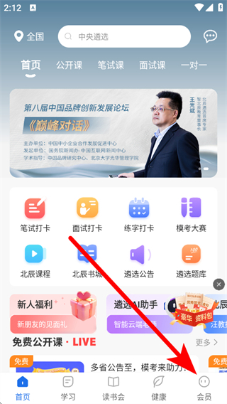 1、在北辰遴选的首页,点击底部会员按钮,进入个人的页面。