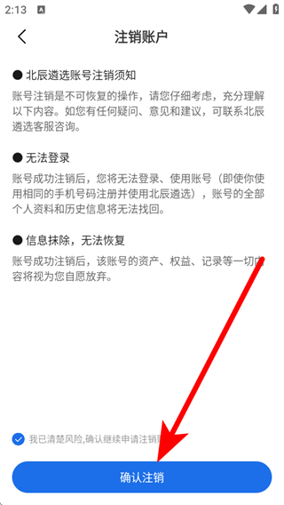 4、在说明页面,勾选同意后点击确认注销,完成账号注销操作。