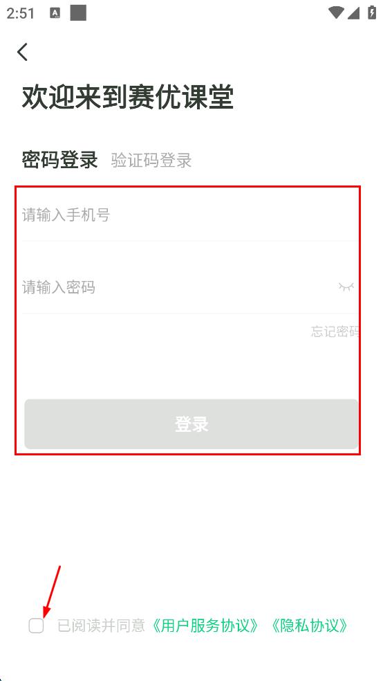 4、在登录页面,输入手机号和密码,勾选已阅读并同意相关协议,点击登录,即可完成赛优课堂的登录。