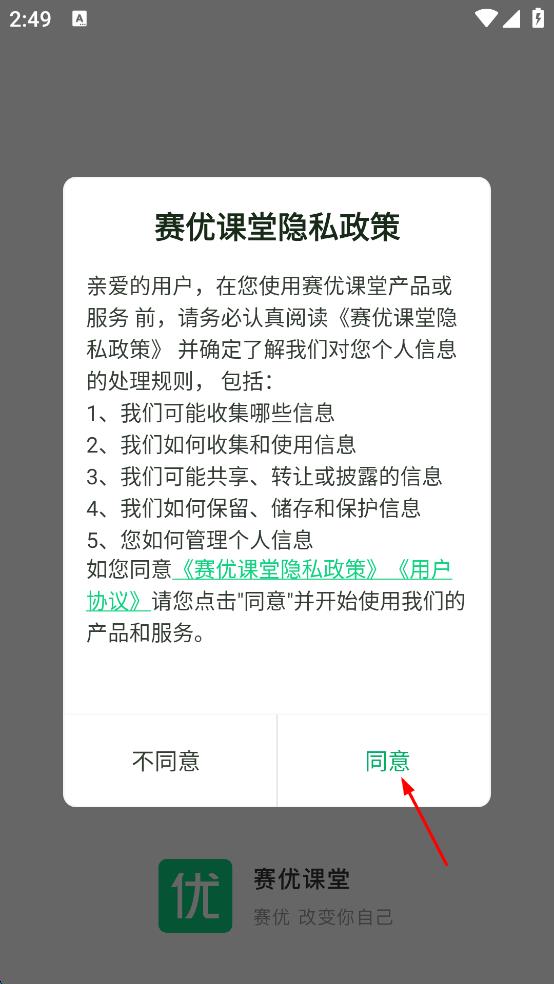 1、打开赛优课堂,在弹出的隐私政策页面,点击同意,进入赛优课堂首页。