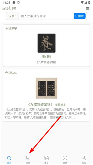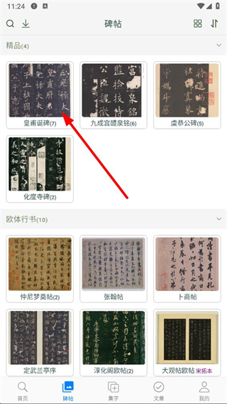 1、打开欧阳询书法字典app,点击底部导航栏中的碑帖选项,进入碑帖浏览页面。