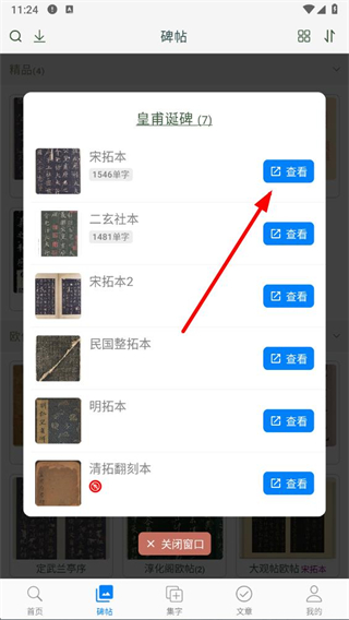 3、点击后会弹出碑帖版本选择窗口,选择要查看的碑帖版本,点击其对应的查看按钮。