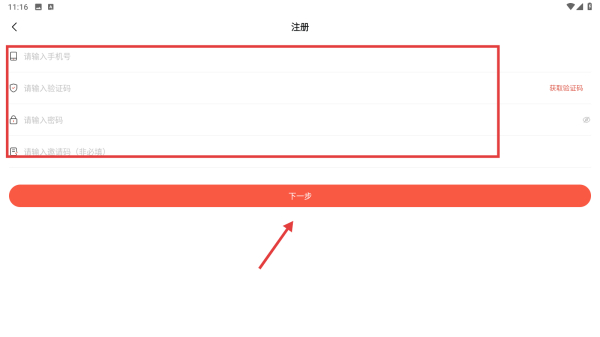 4、在注册页面,依次输入手机号码、验证码、密码、邀请码,勾选同意协议后,点击下一步按钮,完成账号注册操作。
