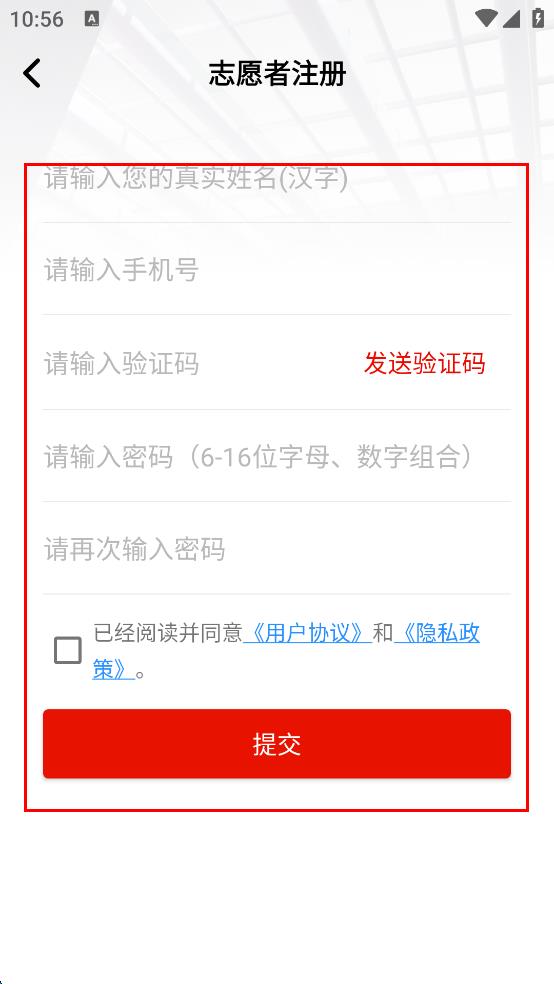 4、在志愿者注册页面,依次输入真实姓名、手机号、验证码、密码并再次确认密码,勾选同意相关协议后,点击提交按钮。