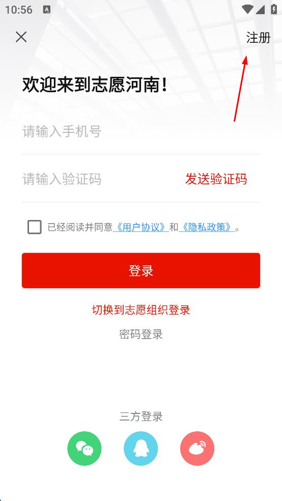 3、在登录页面,点击右上角注册选项,进入志愿者注册页面。