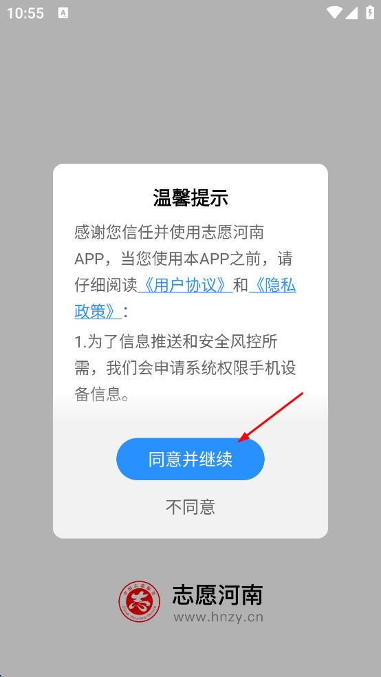 1、打开志愿河南App,在温馨提示弹窗中,点击同意并继续按钮,进入首页。