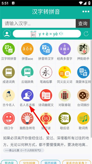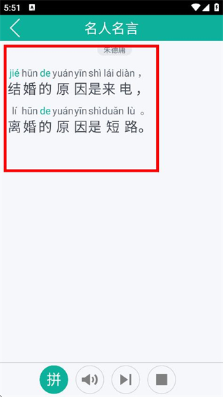 4、在名人名言详情页,可查看该名言的拼音及文字内容。