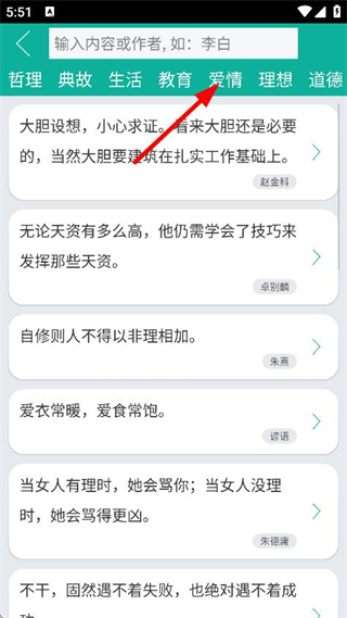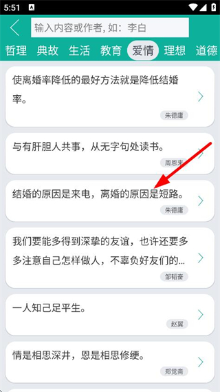 2、在名人名言库页面,点击爱情分类,查看爱情类名人名言。