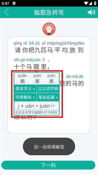 3、点击题目中的多音字,可查看该字的拼音等相关信息。
