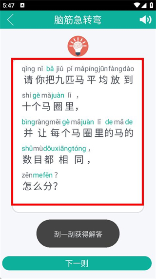 2、在脑筋急转弯页面,可查看当前显示的脑筋急转弯题目。