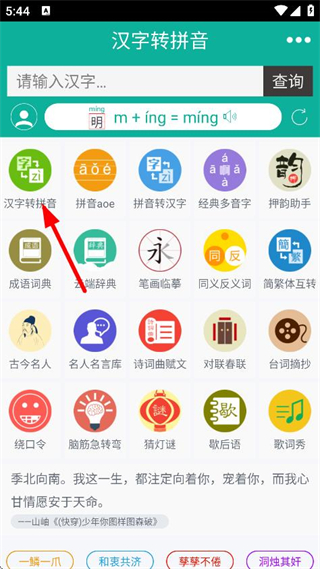 汉字转拼音是由东莞市冰灯云计算有限公司开发的汉字拼音学习平台,拥有汉语真人发音、普通话测试评分、字典解释、辞典查询功能,还内置成语词典与绕口令模块,既能帮助成人远离生僻字、练就标准普通话,也能让孩子遇到不认识的字时学习读音,逐步养成汉字与拼音学习习惯,是日常学习中必备的实用工具,满足不同人群的拼音学习与汉字认知需求。