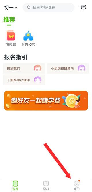 1、在高思教育的首页,需要点击底部我的,进入个人功能页面。