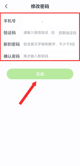 4、在页面填写手机号、验证码及新密码后,点击完成,完成密码修改操作。