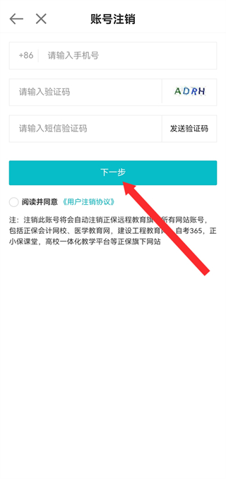3、在信息填写页面,输入信息后点击下一步,进入注销确认页面。