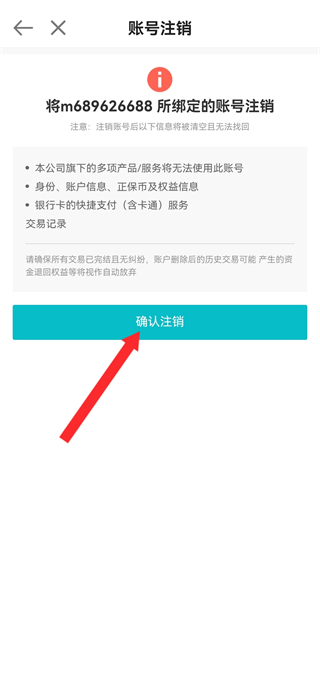 4、在注销确认页面,点击确认注销按钮,完成账号注销的操作。