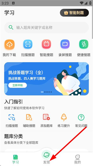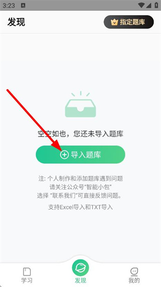 2、在发现页面,点击导入题库,进入选择文档页面。