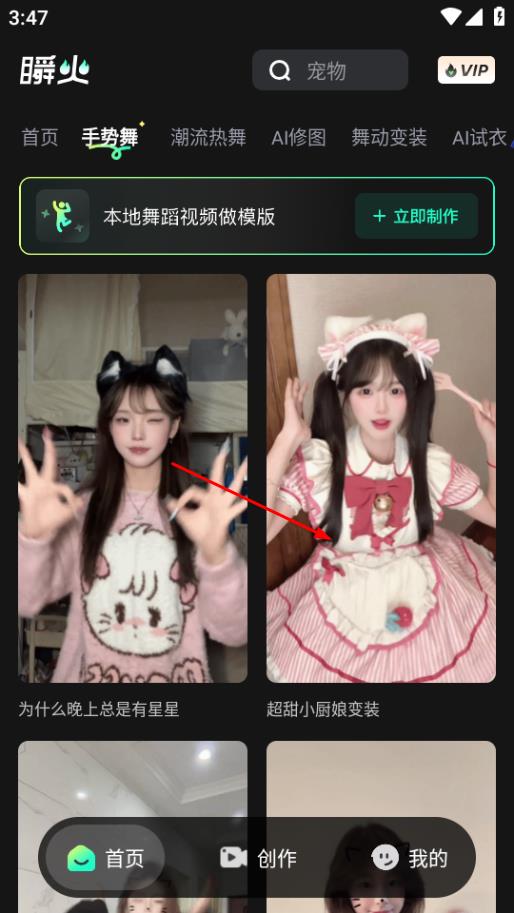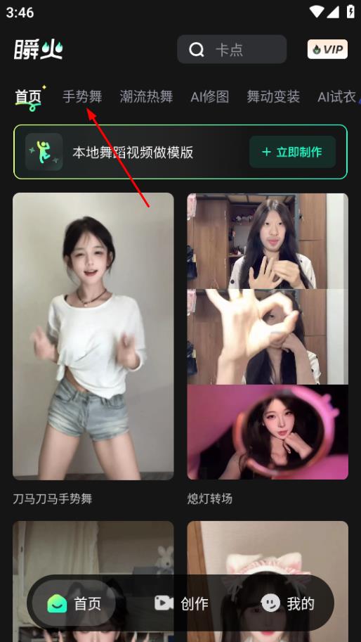 1、在瞬火首页点击手势舞,进入手势舞模板展示页面。
