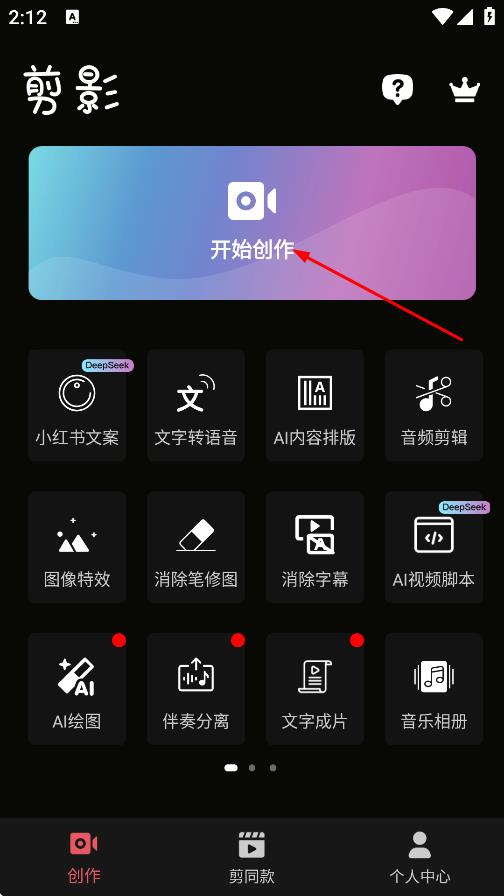 1、在剪影创作页面,点击开始创作,进入素材选择页面。