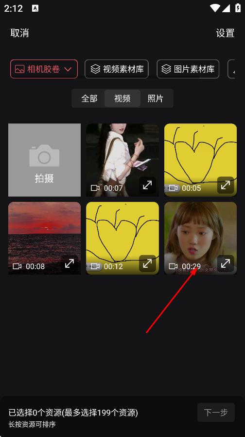 2、在素材选择页面,选择要编辑的视频素材,进入视频编辑页面。