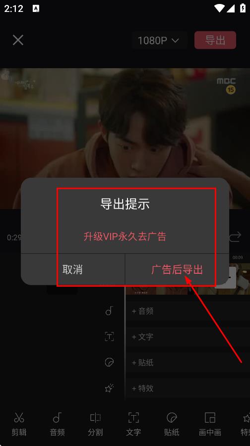 4、在导出提示弹窗中,点击广告后导出,等待广告播放后完成视频导出。