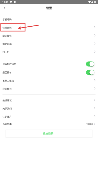 3、在设置页面,点击修改密码选项,进入密码修改页。