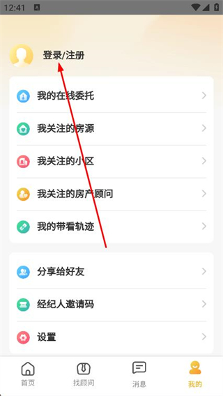 2、在我的页面,找到并点击上方的登录/注册选项。