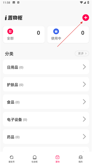 2、在置物柜页面,点击右上角的+号按钮,进入添加物品页面。