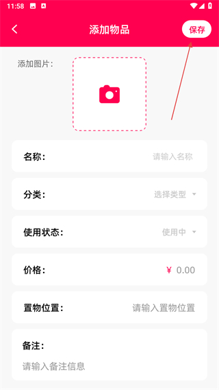 3、在添加物品页面,依次填写物品信息,点击添加图片区域上传物品图片,填写完成后点击右上角的保存按钮。