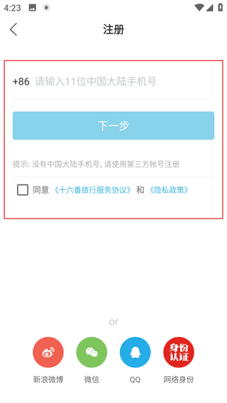 4、在注册页面,输入信息勾选协议后点击下一步,完成注册操作。