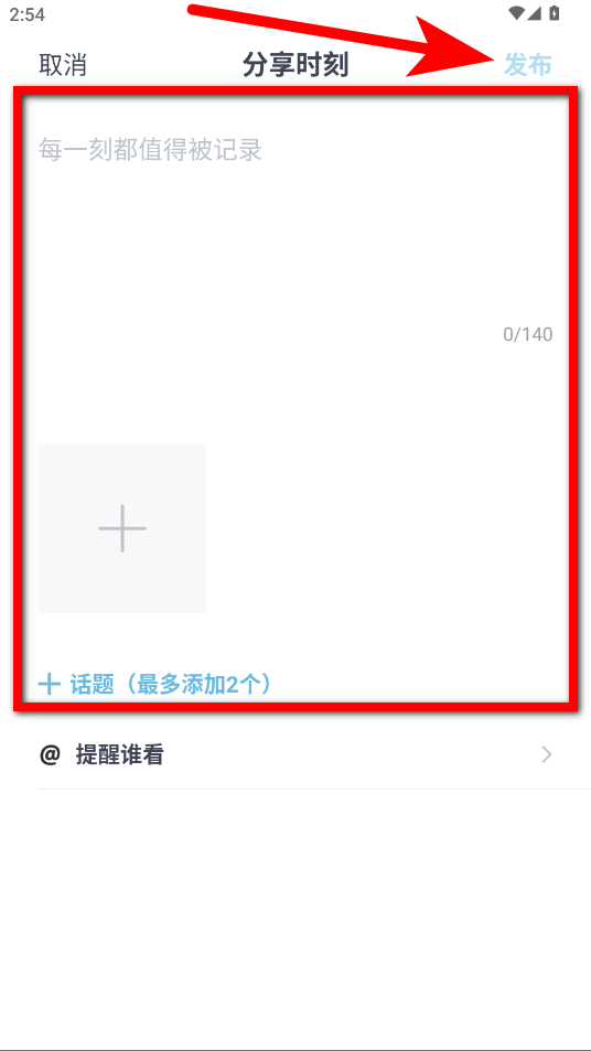 3、在动态编辑页面,输入内容添加图片话题等,编辑完成后点击发布。