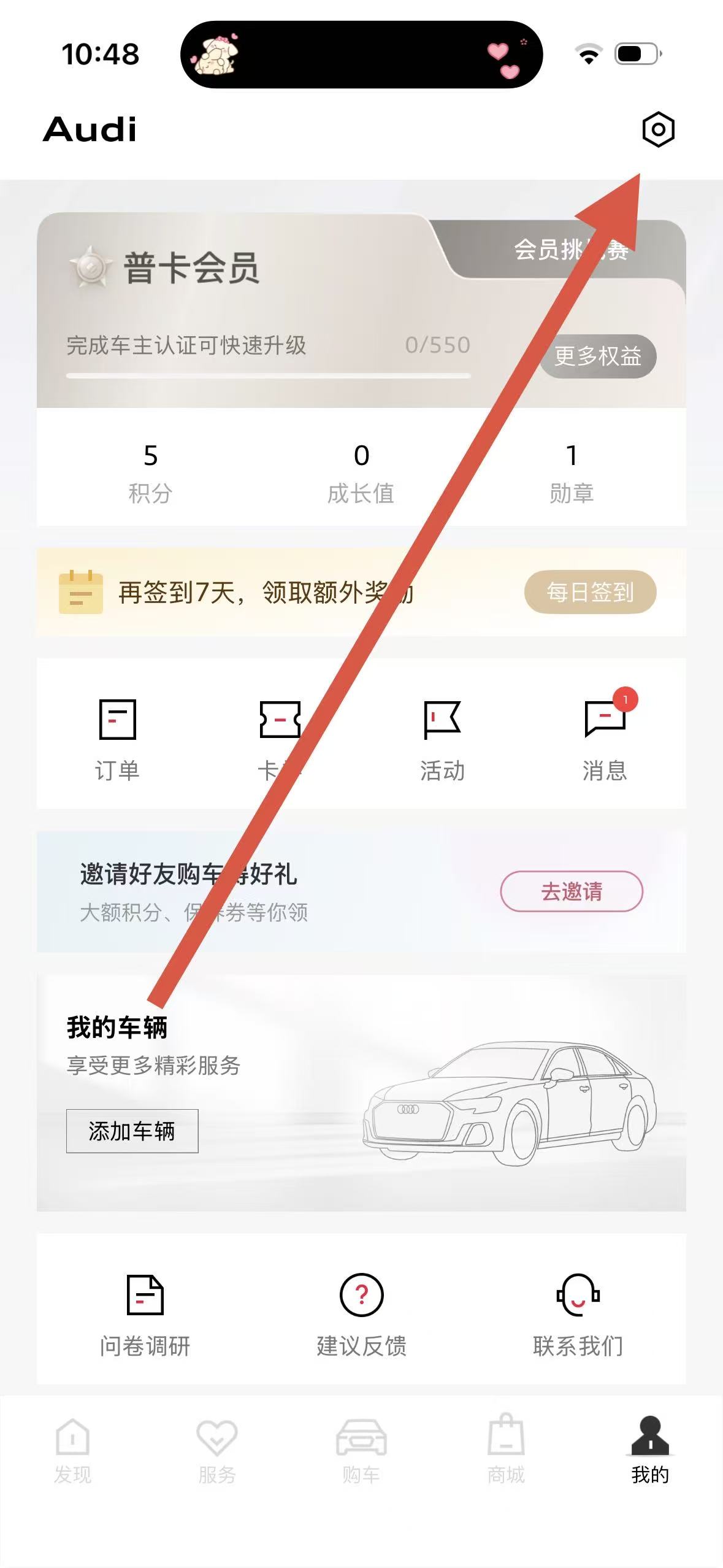 1、在一汽奥迪APP发现页面,点击右下角我的选项,进入个人中心界面。