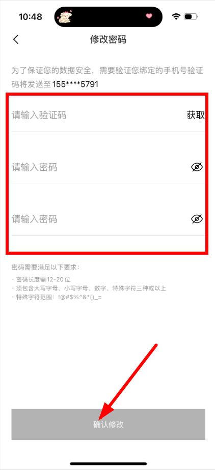 5、在修改密码页面,输入验证码、新密码等,点击确认修改,完成密码修改操作。