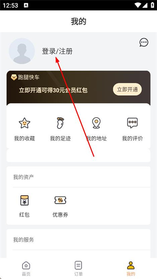 2、在我的页面中,点击登录/注册区域进入登录界面。